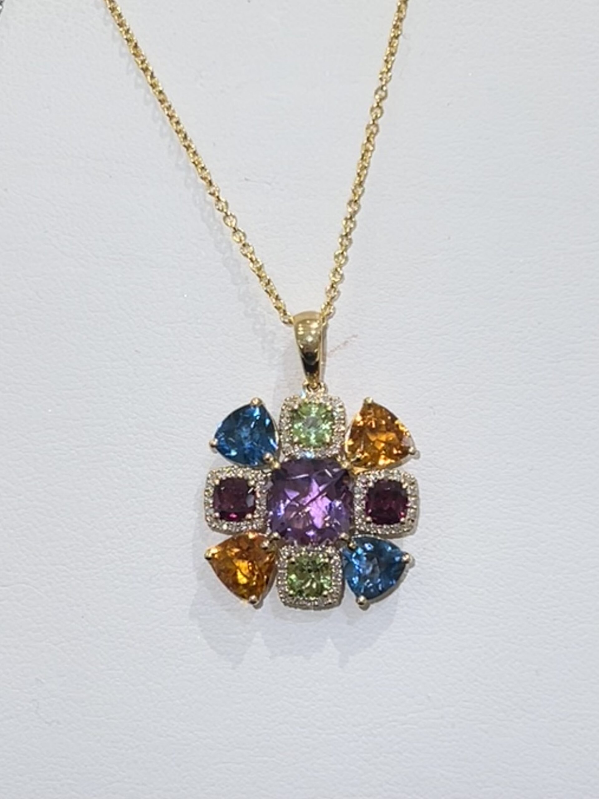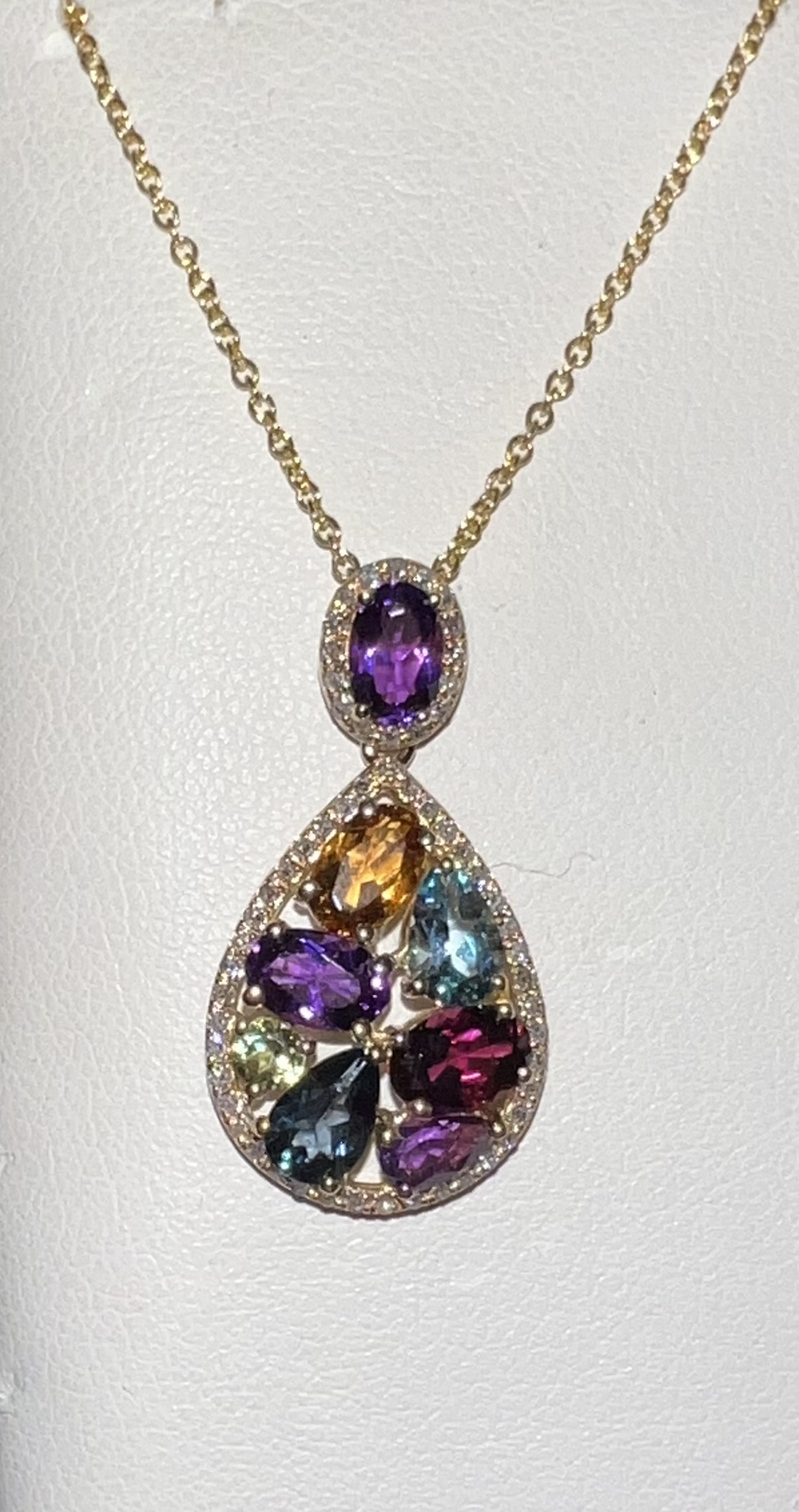 Set in 14k gold, this beautiful multigemstone pendant includes precious and semi-precious stones of diamonds, garnet, blue topaz, peridot, citrine, and an amethyst solitaire. Current price $600.00
